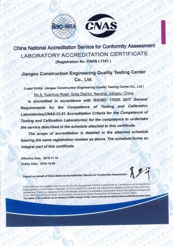 國家城市軌道交通建設(shè)工程產(chǎn)品質(zhì)量監(jiān)督檢驗中心, 依托江蘇省建筑科學研究院和江蘇省建筑工程質(zhì)量檢測中心在城市軌道交通建設(shè)工程領(lǐng)域的綜合技術(shù)優(yōu)勢,于2016年10月獲得國家認證認可監(jiān)督委員會批準授權(quán)..